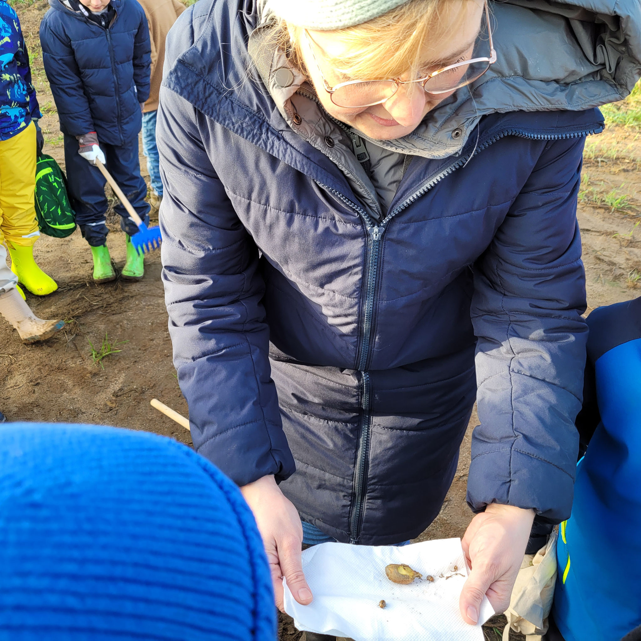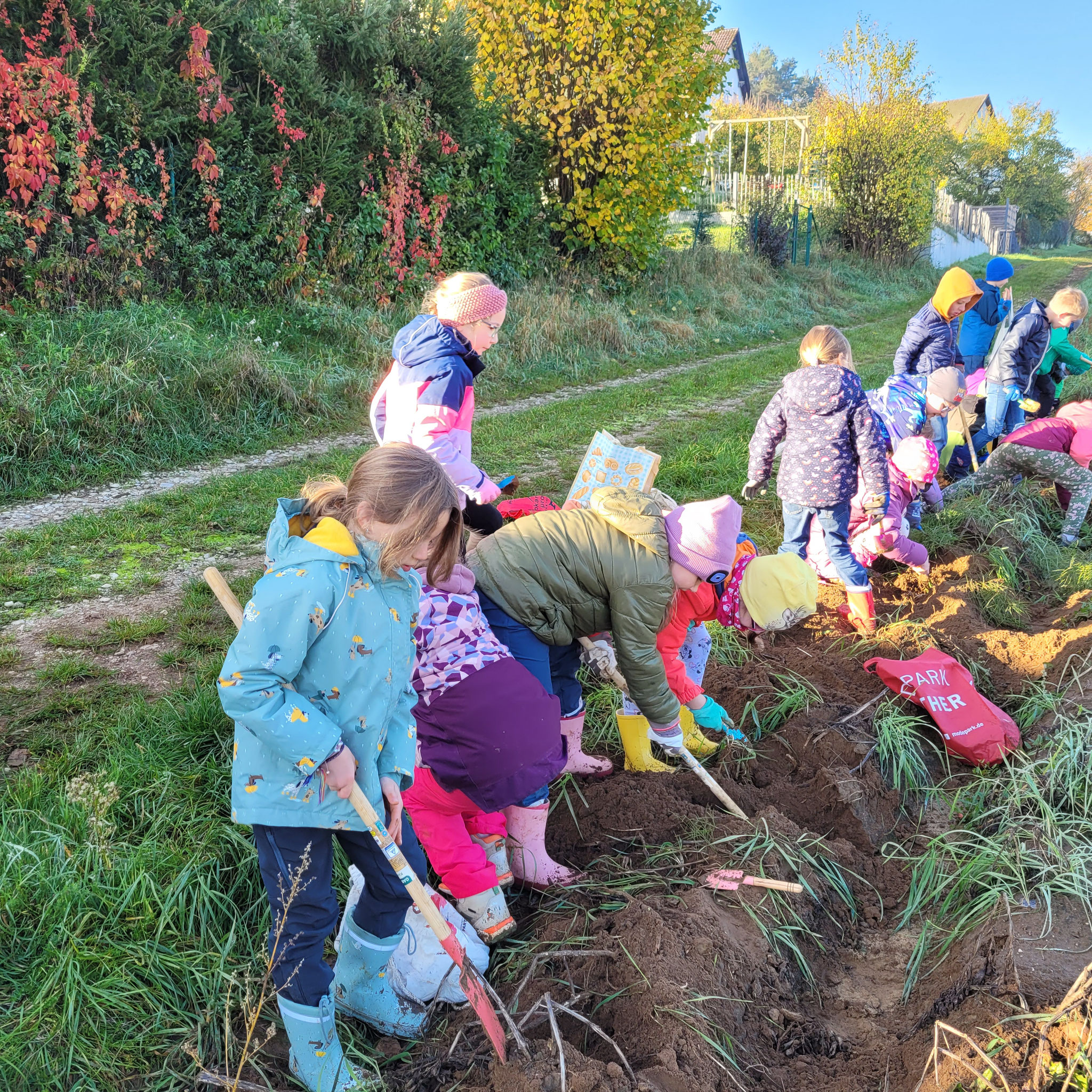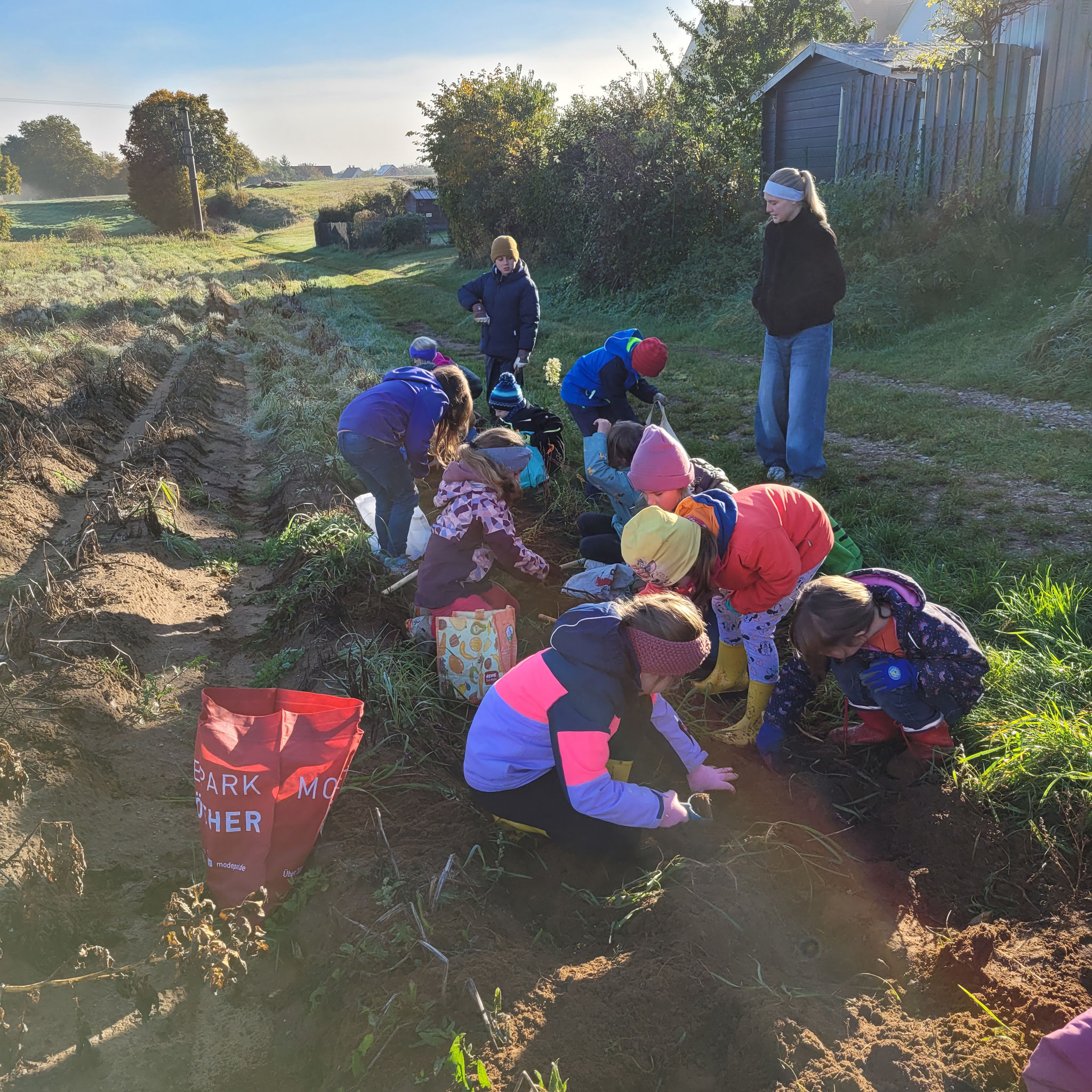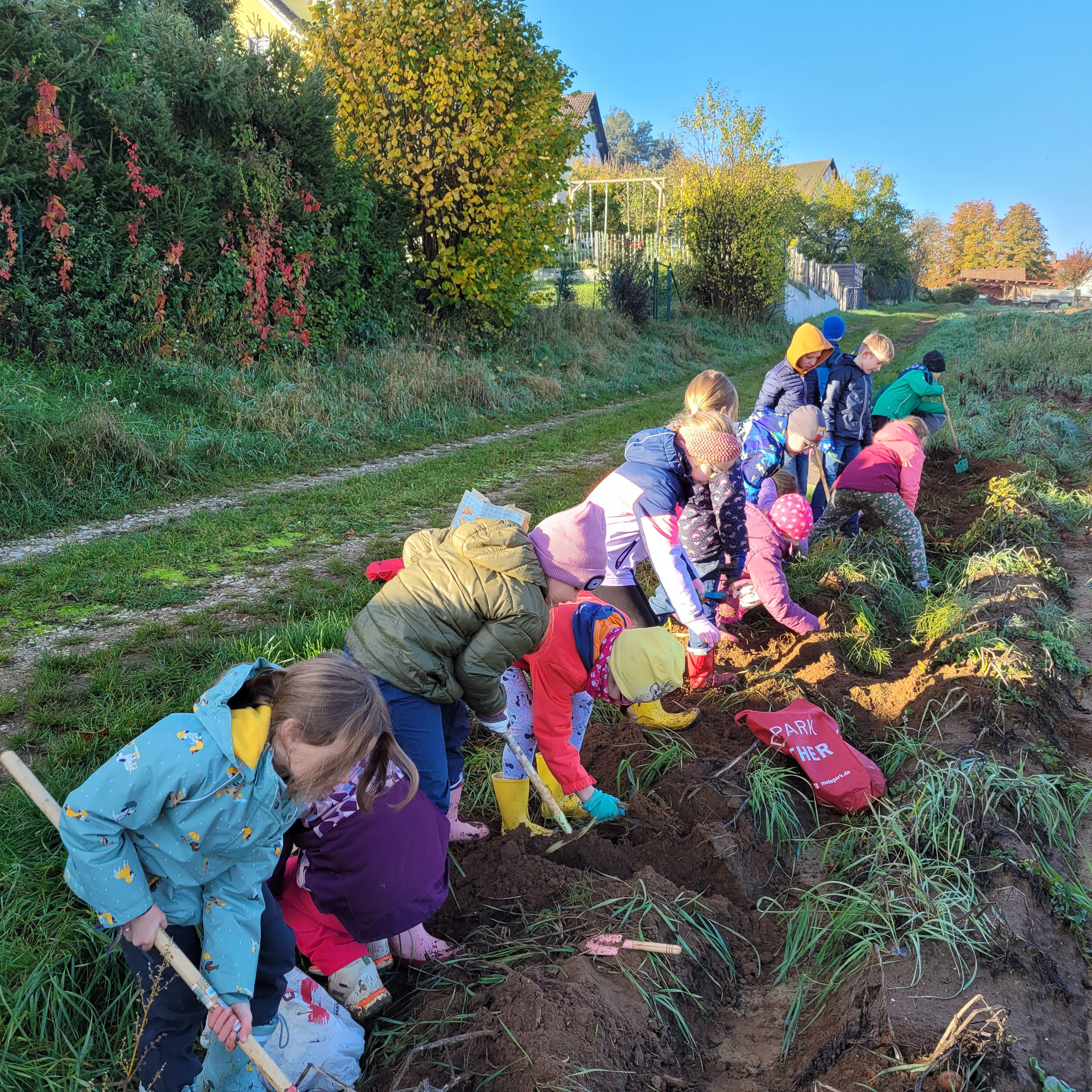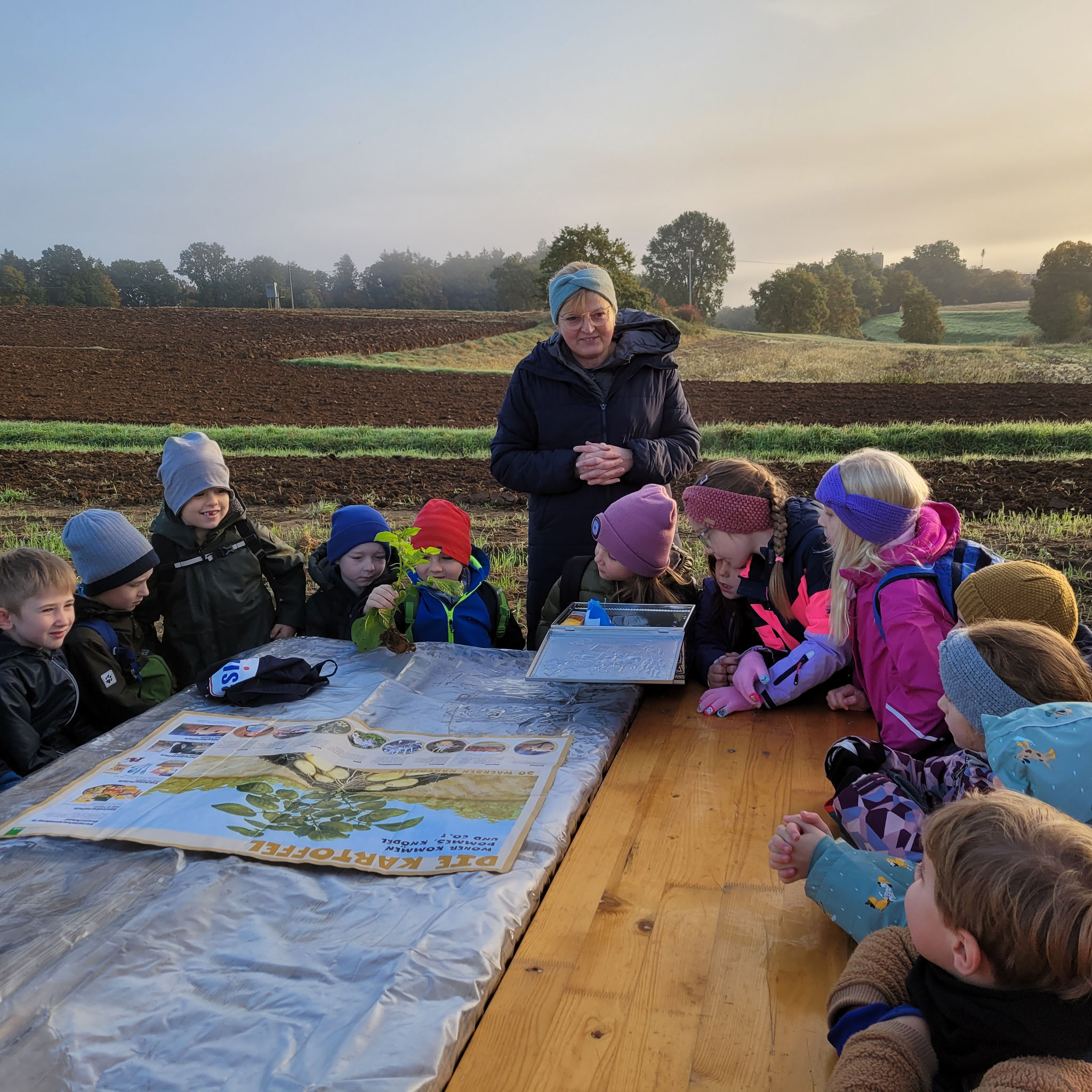 Der Höhepunkt war jedoch die Ernte: Ausgerüstet mit kleinen Schaufeln und Rechen durften die Kinder selbst auf dem Feld Kartoffeln ausgraben. Mit Eifer und Begeisterung suchten sie nach den goldgelben Knollen – und die Freude war groß, als schließlich der Kartoffelkönig gekürt wurde: die schwerste Kartoffel des Tages!