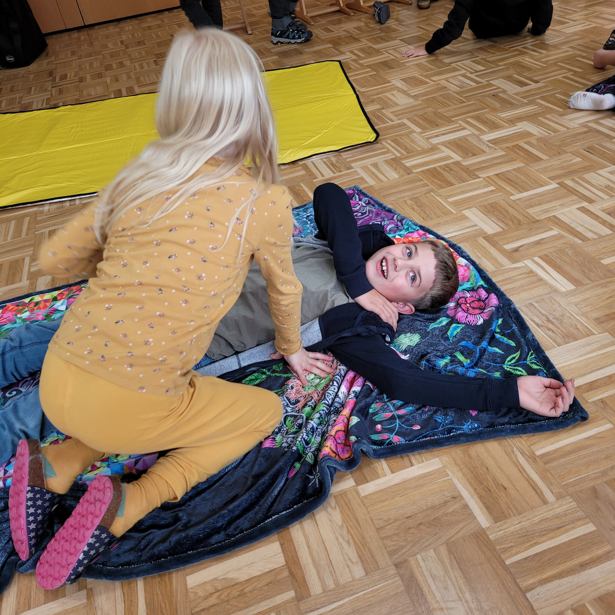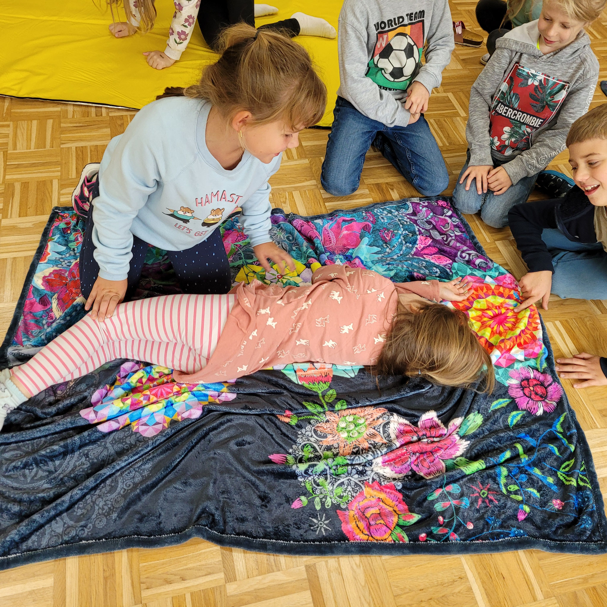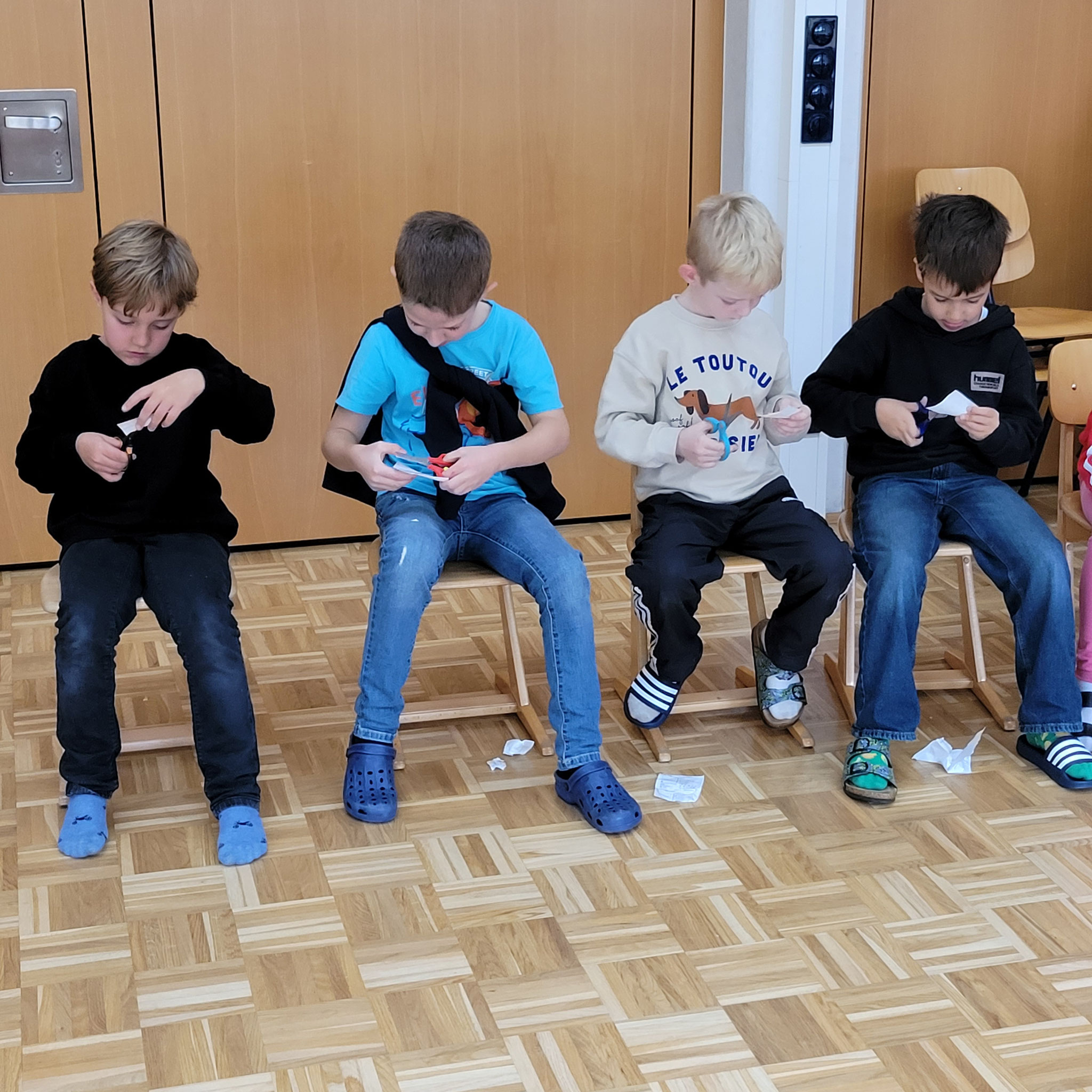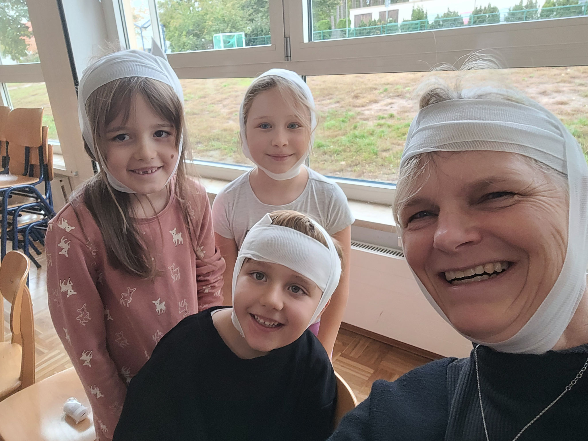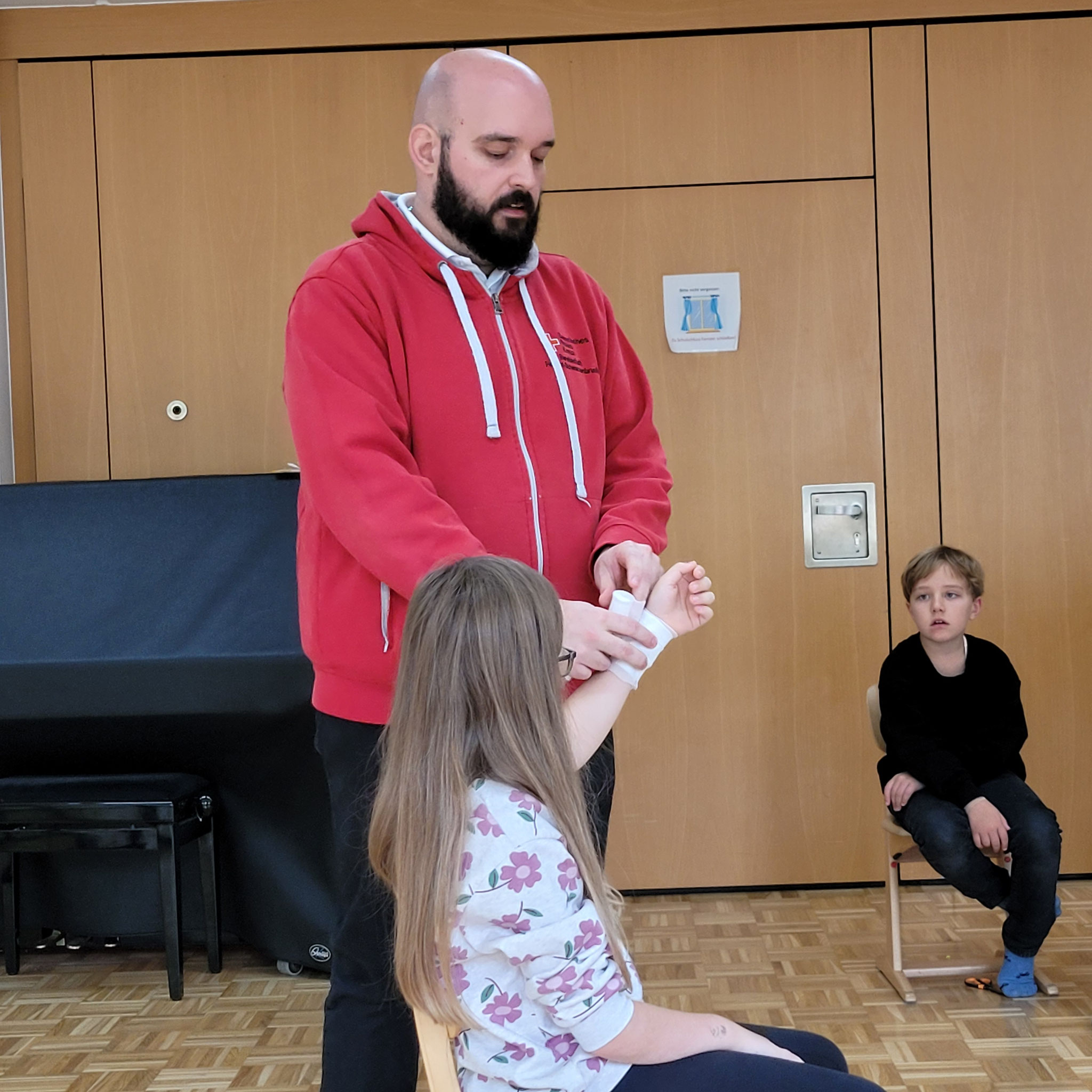 Natürlich durfte auch das praktische Üben nicht fehlen. Mit viel Eifer probierten die Kinder aus, die stabile Seitenlage durchzuführen, um eine bewusstlose Person in Sicherheit zu bringen. Außerdem legten sie sich gegenseitig Fingerverbände, Druckverbände und sogar Kopfverbände an. Dabei wurde viel gelacht, ausprobiert und gelernt.