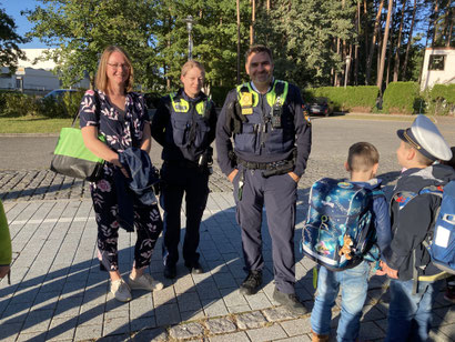 Für bessere Sichtbarkeit erhielt jedes Erstklasskind nach der Busfahrt einen neongelben Überwurf ausgehändigt. Zusätzliche Reflektoren helfen, noch besser von Autofahrern wahrgenommen zu werden, besonders im trüben Herbst und der dunklen Jahreszeit.
