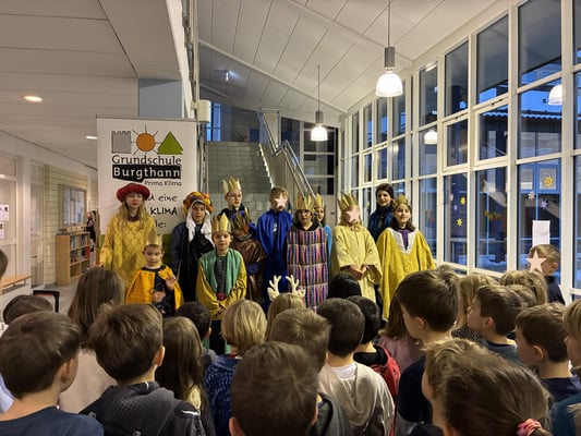 In der ersten Schulwoche im Jahr 2026 erhielt die Grundschule Burgthann royalen Besuch: Die Sternsinger überbrachten in bewährter Weise Segenswünsche für die Schulfamilie. Mitschüler sowie Lehrkräfte zeigten sich mächtig beeindruckt, wie viele Mädchen und Jungen aus ihren Reihen in den Weihnachtsferien als Könige und Sternträger unterwegs waren. Ihr vorbildlicher Einsatz hatte sich gelohnt: In der Pfarrei Winkelhaid-Burgthann konnten rund 17.000 Euro für Familien in Bangladesch gesammelt werden. Die Spenden sollen dazu beitragen, dass Kinder dort eine schulische Bildung erhalten können und nicht zu Kinderarbeit gezwungen werden.